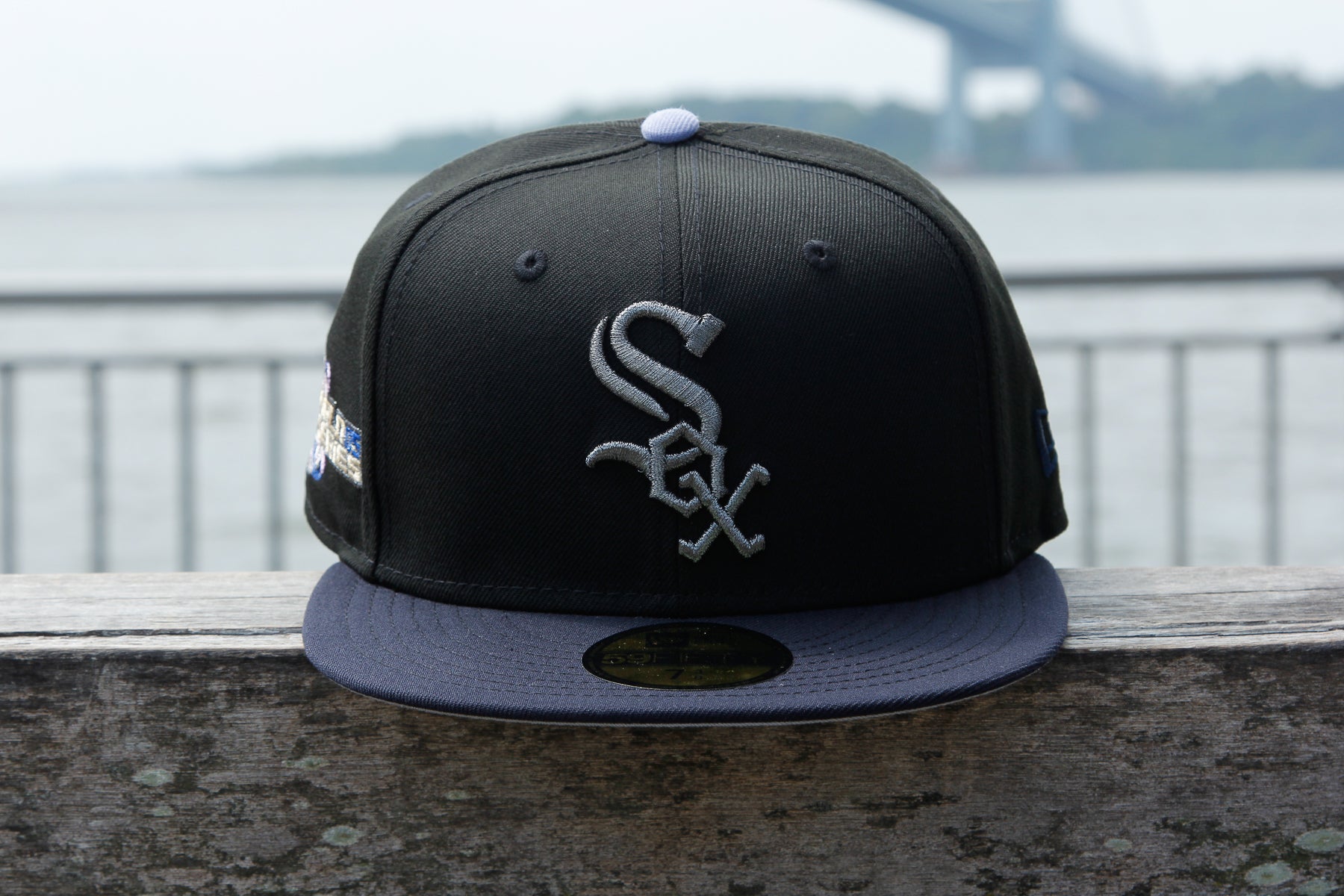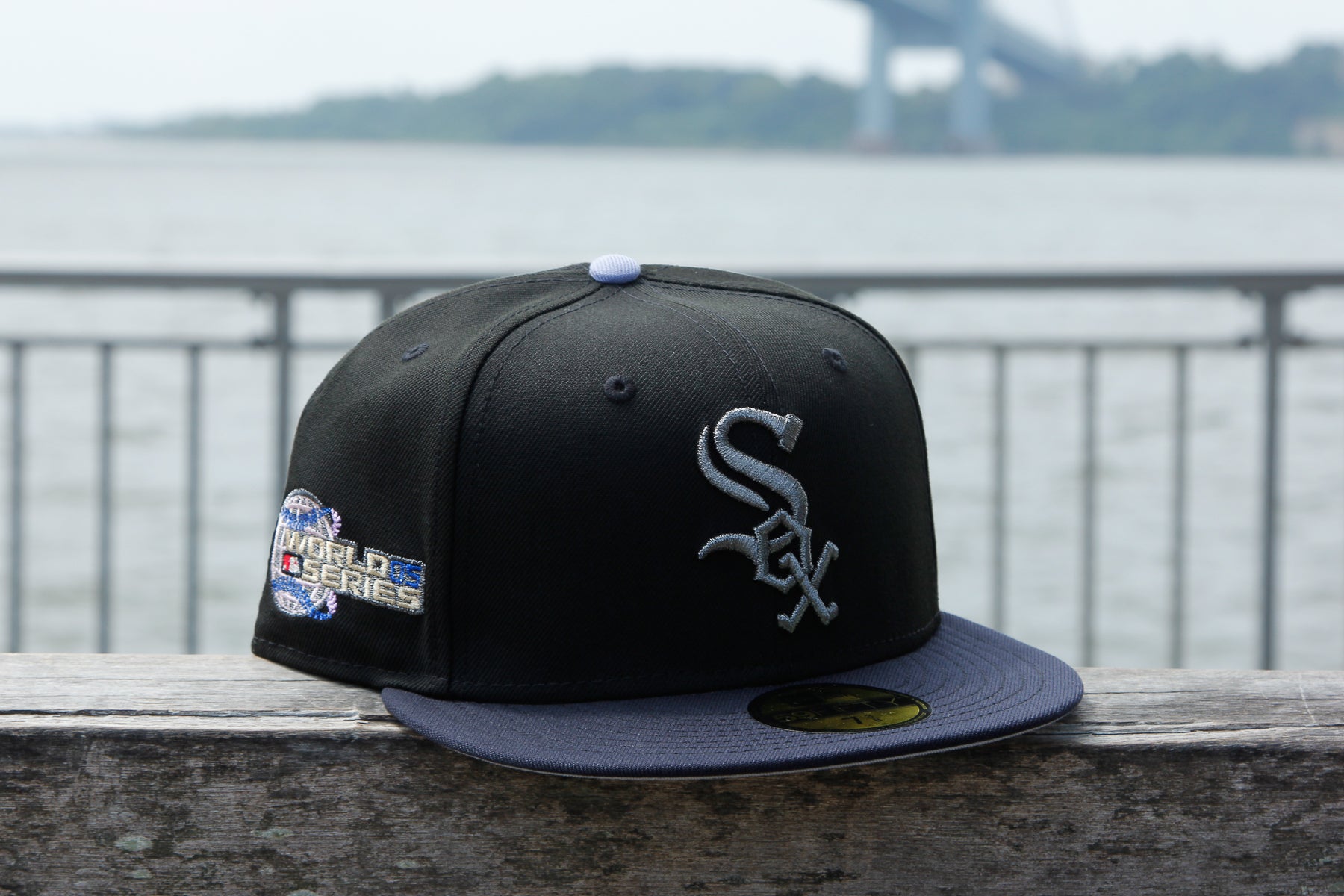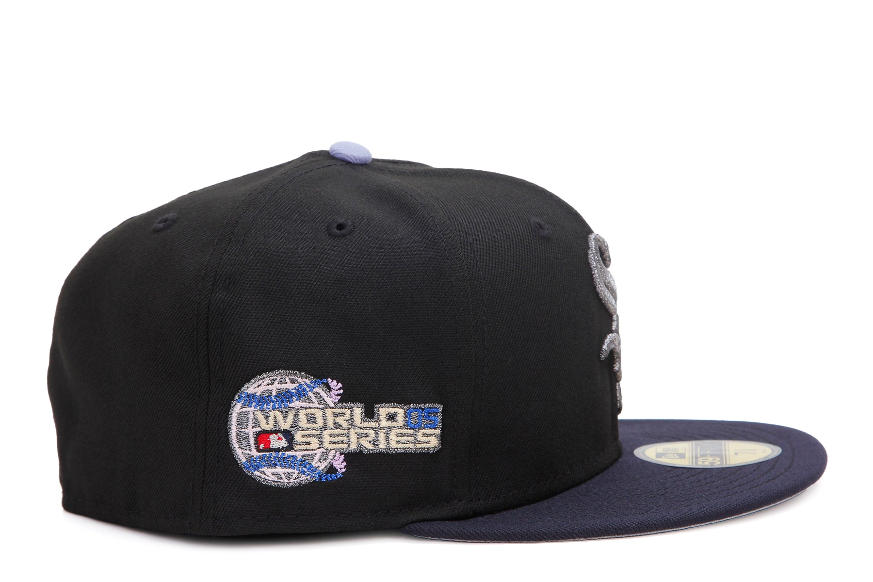 This exclusive New Era 59FIFTY black navy Chicago White Sox fitted cap feature metallic pewter Sox front logo, black New Era flag logo and metallic MLB Batterman cooperstown collection. Chicago White Sox 2005 World Series side patch. Grey Undervisor.