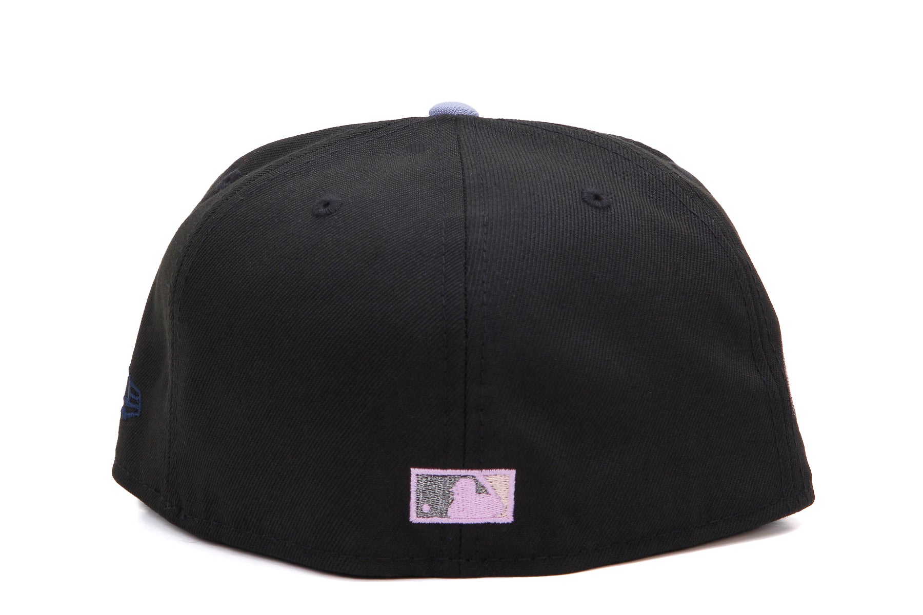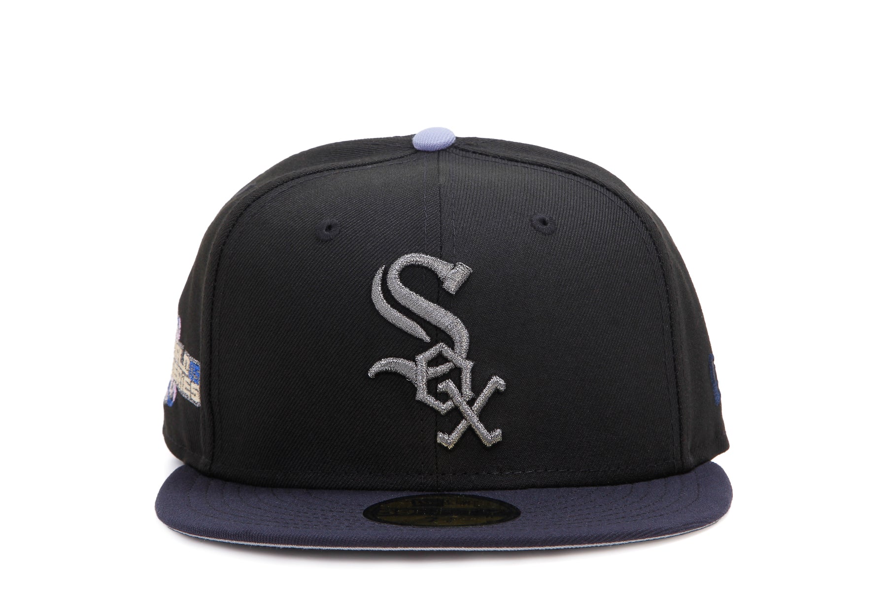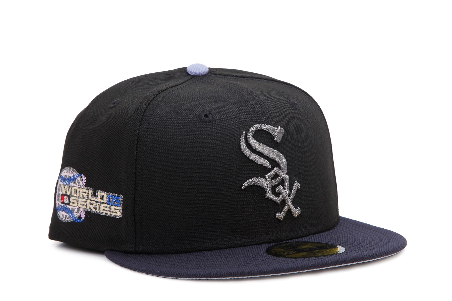 This exclusive New Era 59FIFTY black navy Chicago White Sox fitted cap feature metallic pewter Sox front logo, black New Era flag logo and metallic MLB Batterman cooperstown collection. Chicago White Sox 2005 World Series side patch. Grey Undervisor.