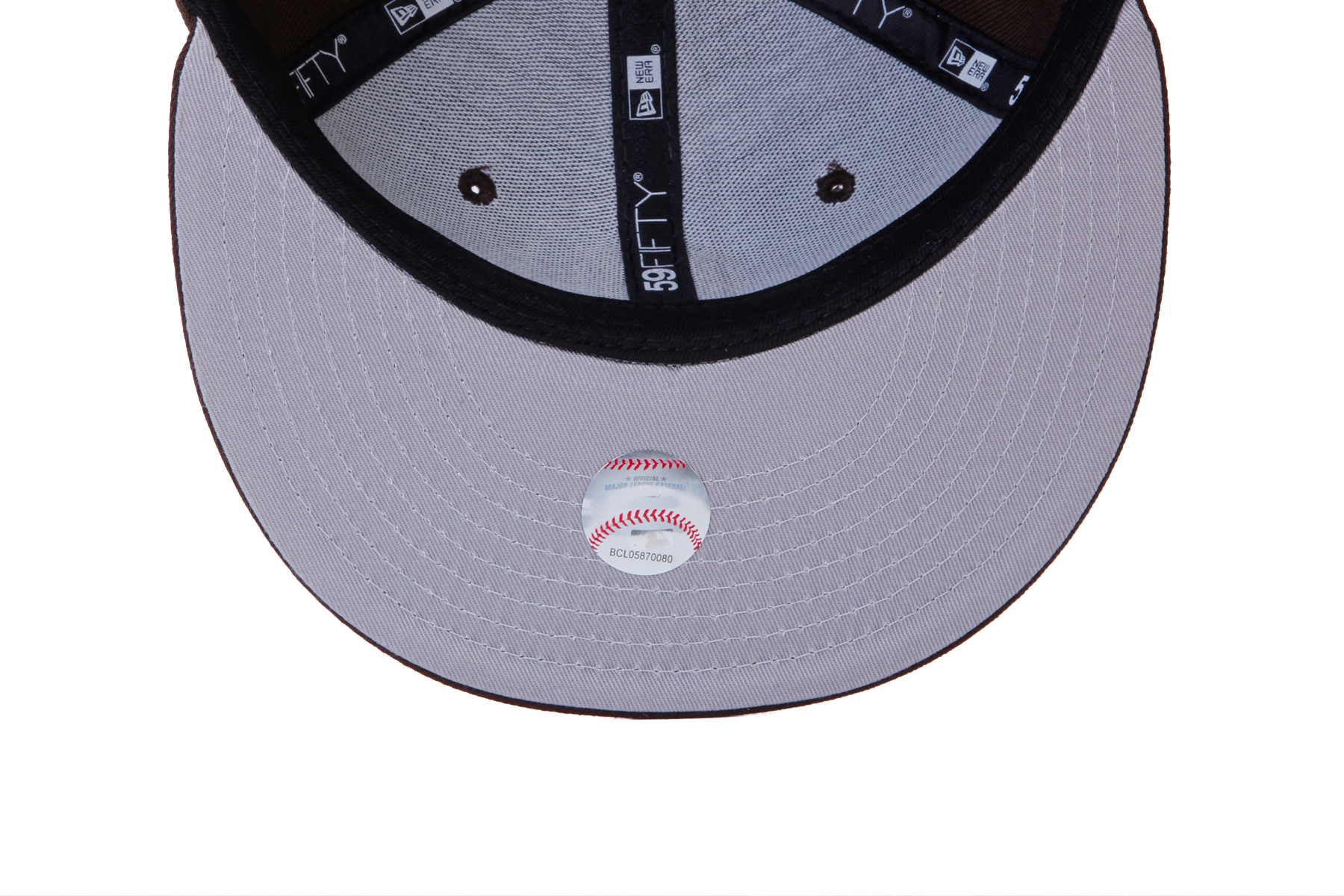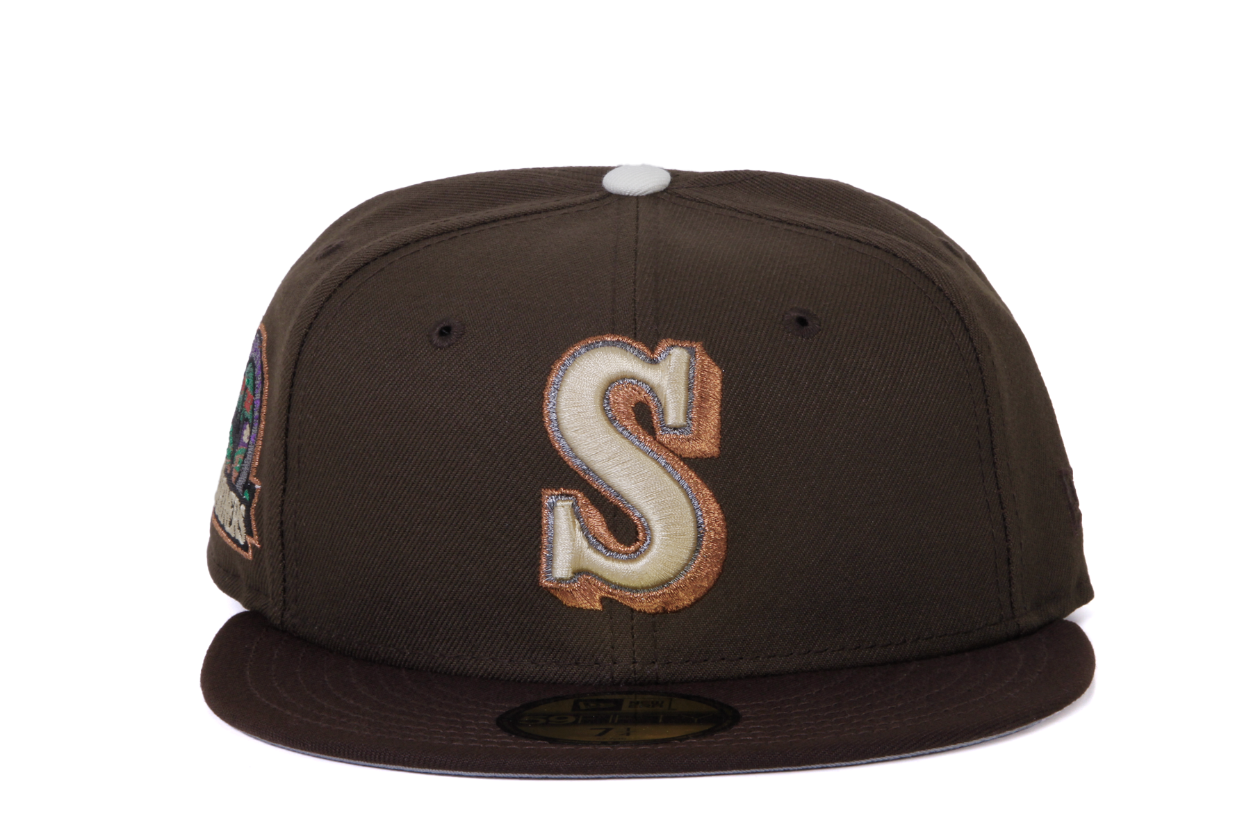 New Era 59FIFTY fitted Seattle Mariners cap feature Seattle Mariners "S" copper metallic front logo, brown walnut New Era flag logo and MLB Cooperstown collection metallic logo at the back. Seattle Mariners 30Th anniversary 1977-2007 metallic side patch. Grey Undervisor. Part of the THEKEYSTONE fitted hat collection.