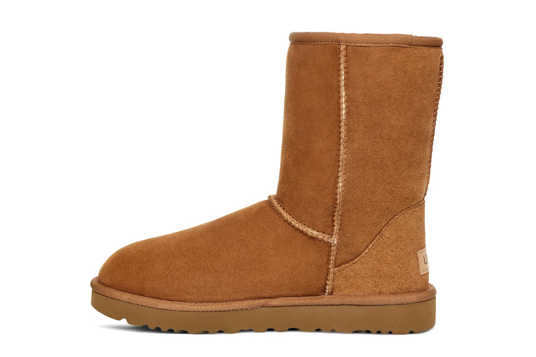 The UGG Women’s Classic Short II boots offer a convenient pull-on design enhanced with water, moisture, and stain-resistant pre-treated suede. They feature a cozy wool lining and a sheepskin insole to provide exceptional warmth and comfort. Lightweight yet durable, these winter boots are equipped with UGG’s long-lasting Treadlite outsole, ensuring reliable traction and wear resistance in cold weather conditions.