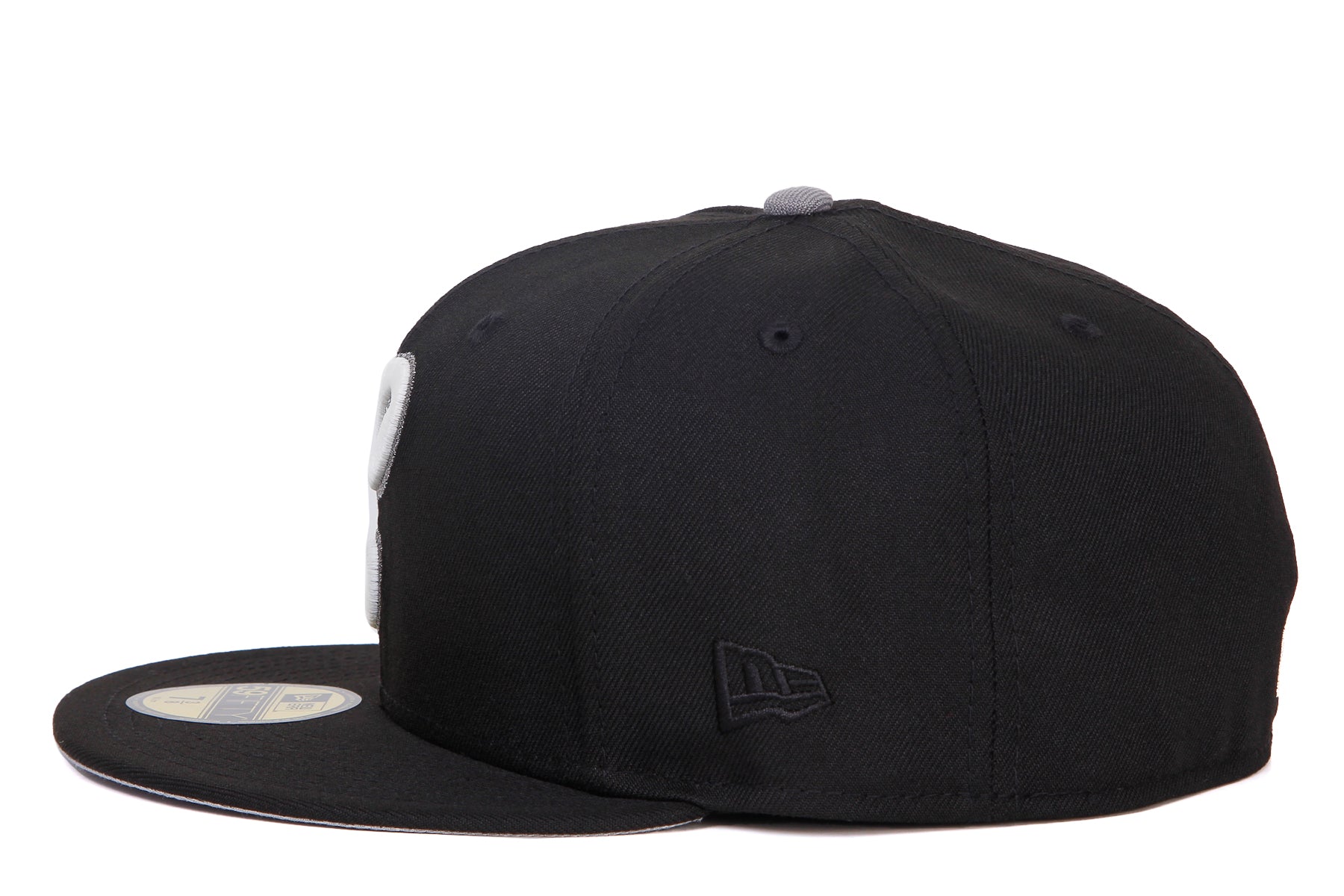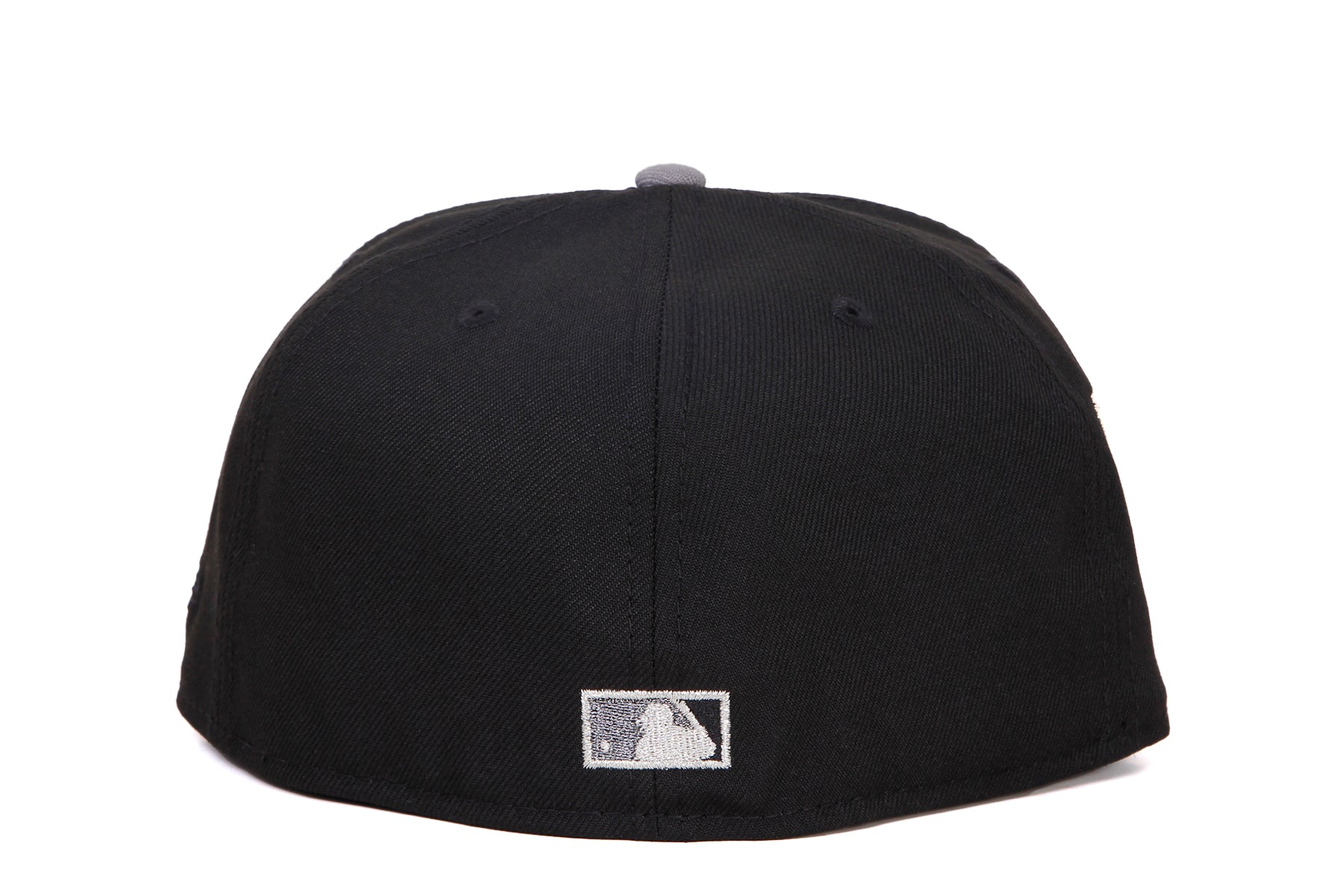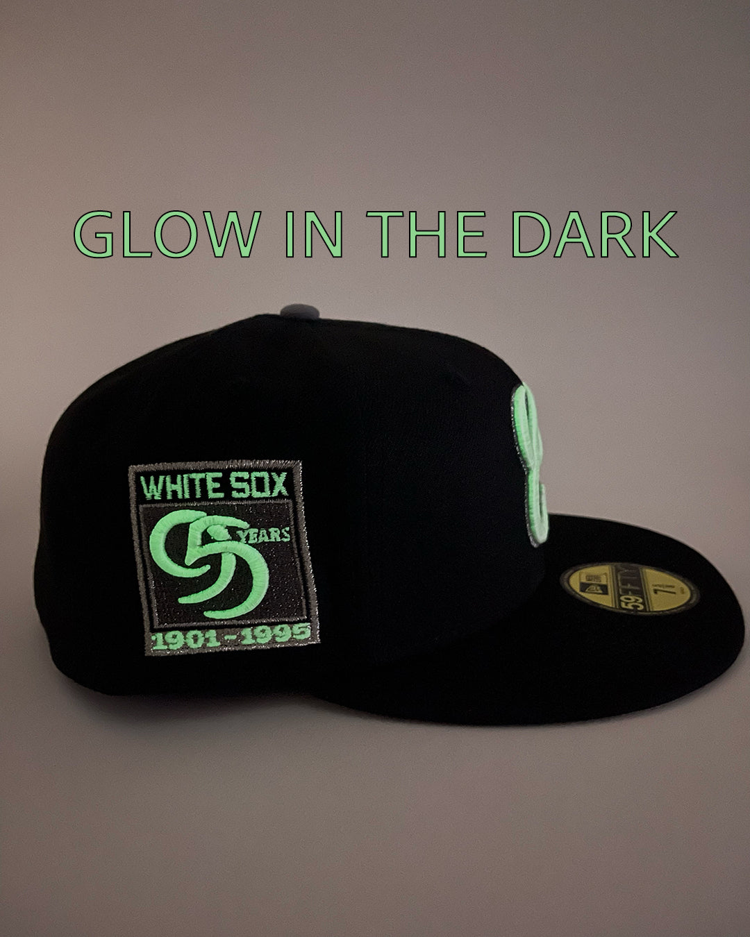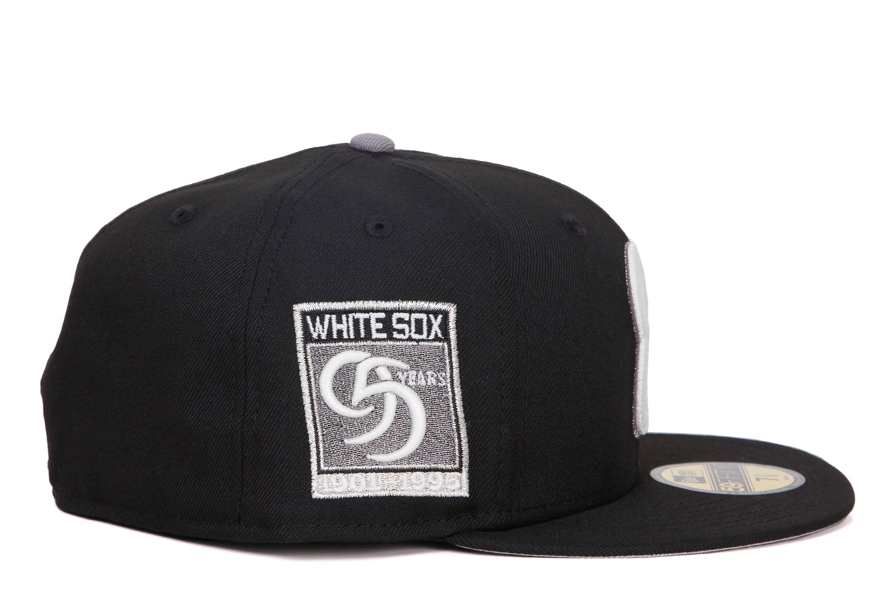 This exclusive New Era 59FIFTY black Chicago White Sox fitted cap feature metallic pewter Chicago White Sox "C" front logo, black New Era flag logo and metallic MLB Batterman cooperstown collection. Chicago White Sox 95 Years Anniversary side patch. Grey Undervisor.