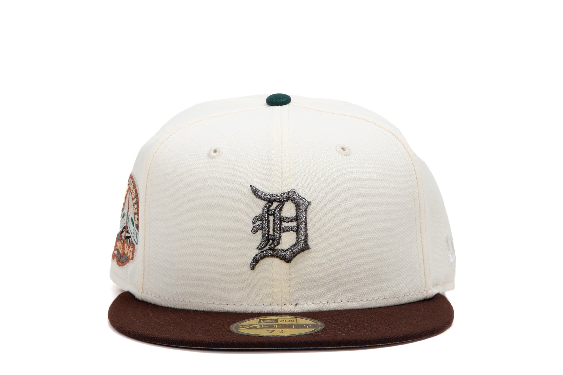 This exclusive New Era 59FIFTY fitted cap chrome white Detroit Tigers feature pewter metallic "D" Detroit Tigers front logo, chrome New Era flag logo and metallic MLB Batterman cooperstown collection. Detroit Tigers stadium 1912-1999 side patch. Grey Undervisor. Part of the Rushmore fitted hat collection.